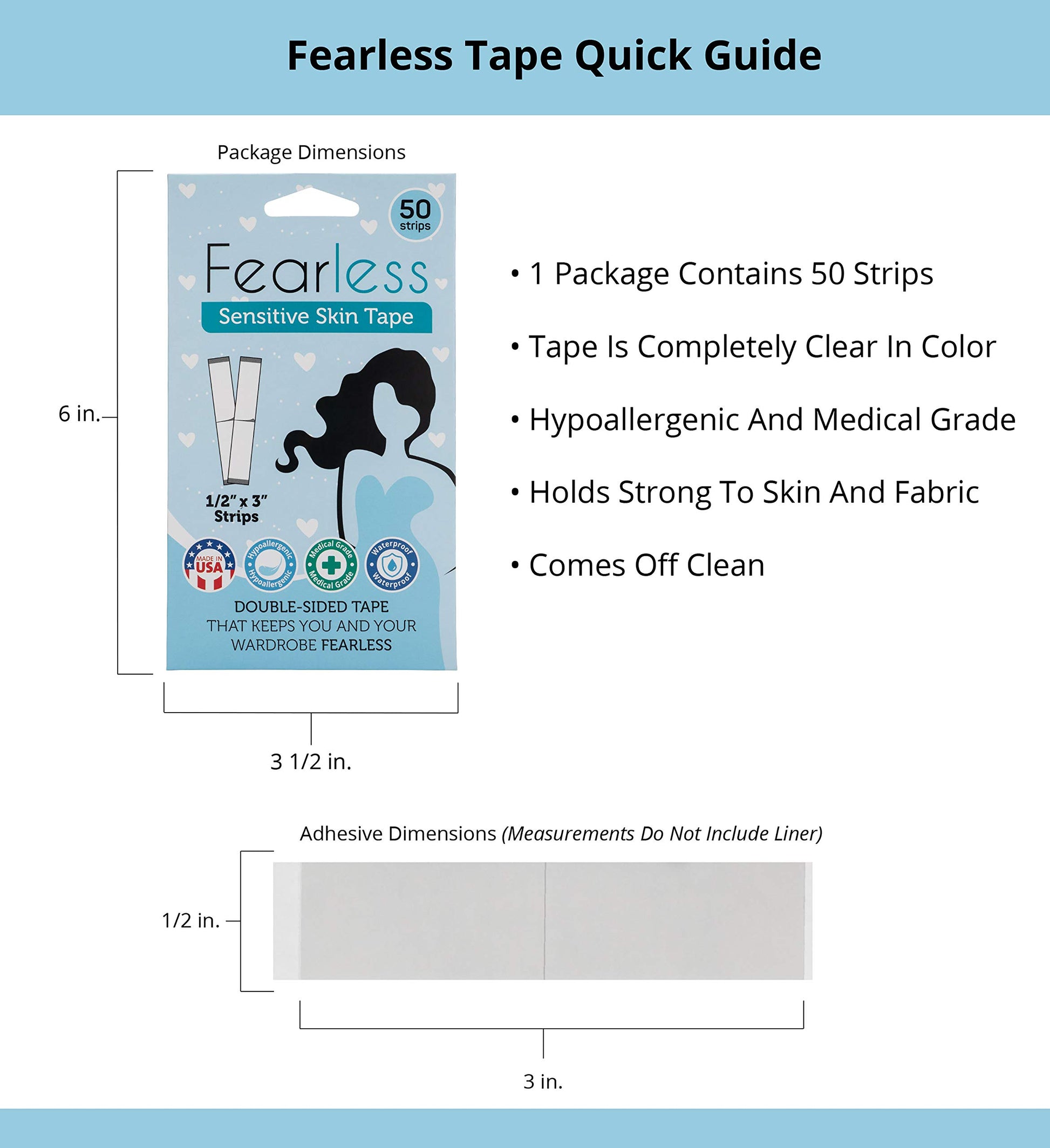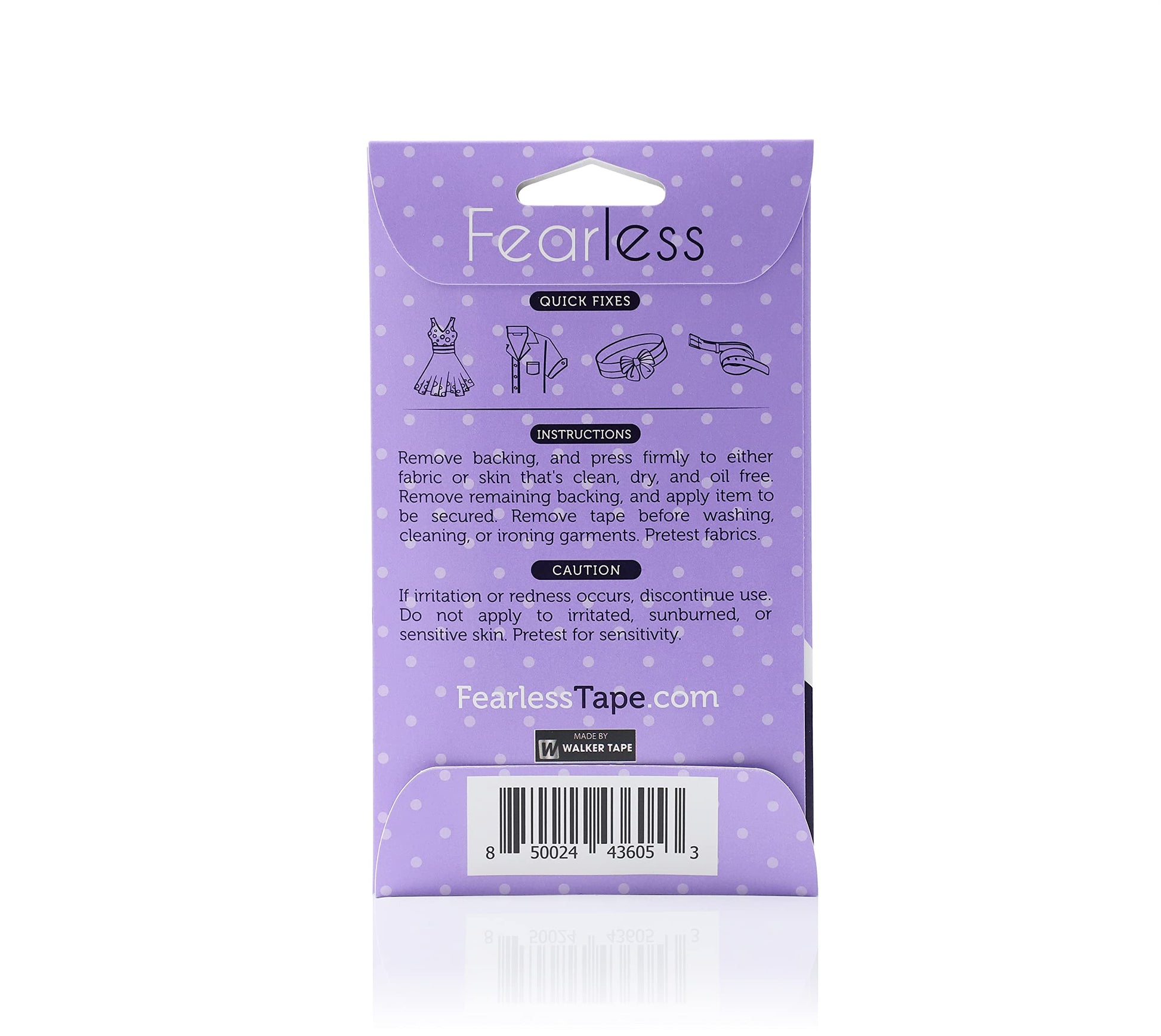 Say goodbye to wardrobe malfunctions with Fearless Tape, the ultimate double-sided tape for clothes, fashion fixes, and body wear. This 70-strip pack of transparent, skin-safe tape offers a strong all-day hold while being gentle on skin and fabrics.